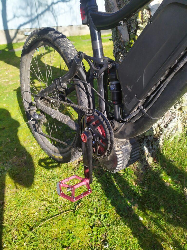 Needed to space the motor out 2mm(towards drive side) to clear the rear swingarm linkages. The rear shock needed to be turned around for battery clearance(would be fine in size L or larger frame).