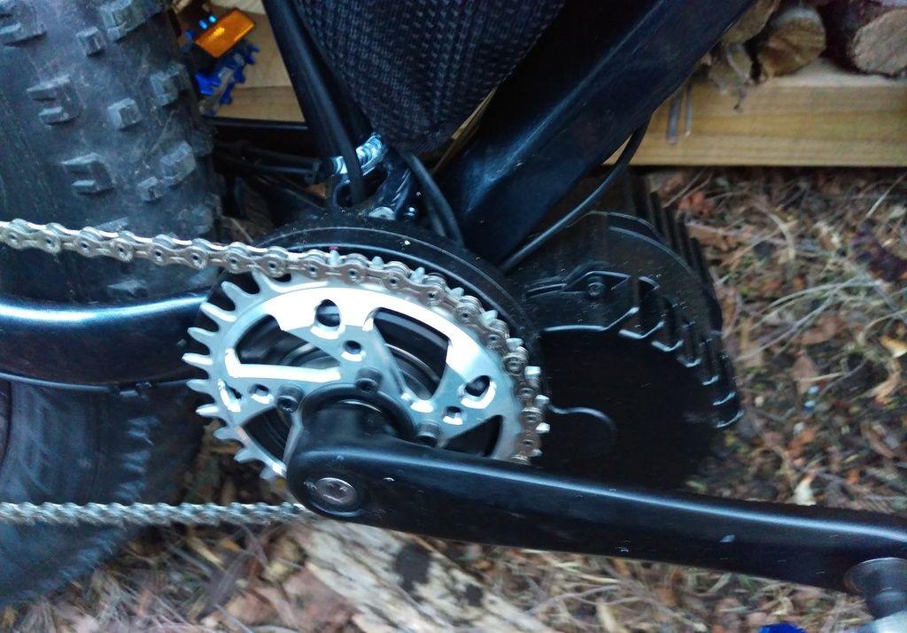 There is room for a bigger chainwheel to clear the frame, without making the chainline worse. I know there are a couple of 42T out there, like the Luna Eclipse. But they move the chain inboard. Perhaps too much, as this lines up pretty well in #5&6 gears (10 speeds). I think I’d like to try to put a 36T on there for slightly higher gearing. But I can’t find an adapter to fit the BBSHD for standard chainrings: