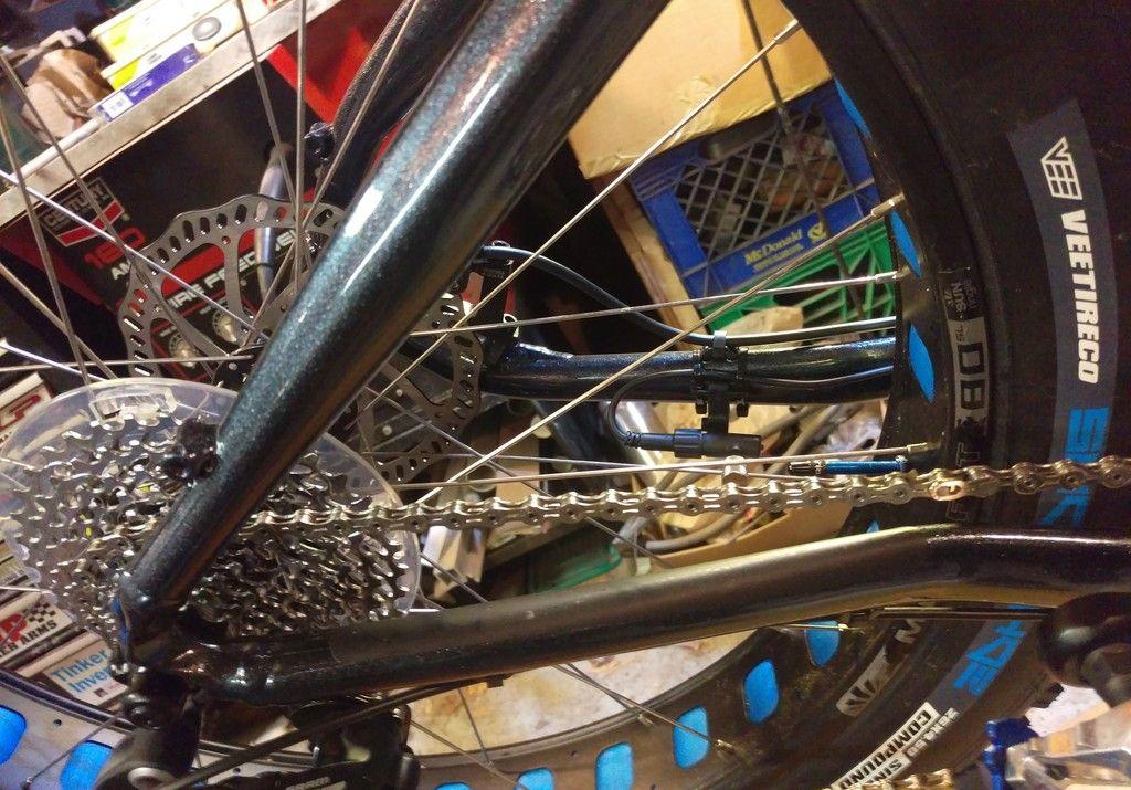 So, how’s the chainline? Not bad! Centered, at least. But there is a fairly big zigzag at the extremes. Tire clearance is real good to the chain. I have not had any trouble with shifting, after re-adjusting the shifter cable length. I have not applied full power in top gear at high speed yet, though, either. I have floored it in low gear, no issue.